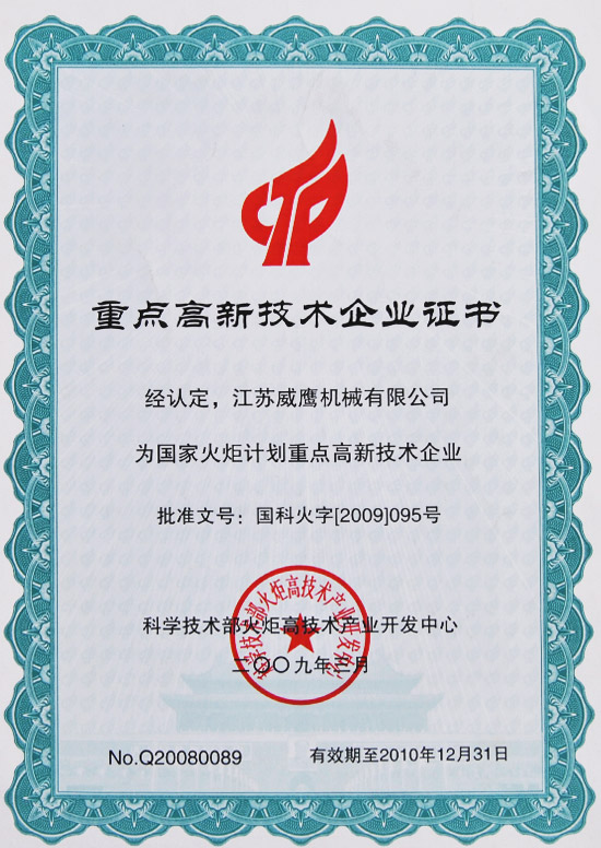 國家火炬計劃重點高新技術企業 2009年 國家科技部火炬高技術產業開發中心