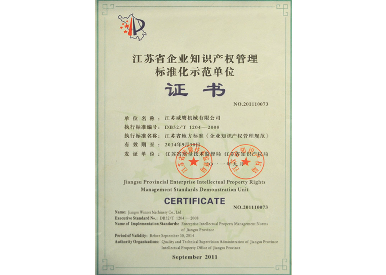 江蘇省企業知識產權管理標準化示范創建先進單位 2011年 江蘇省質量技術監督局